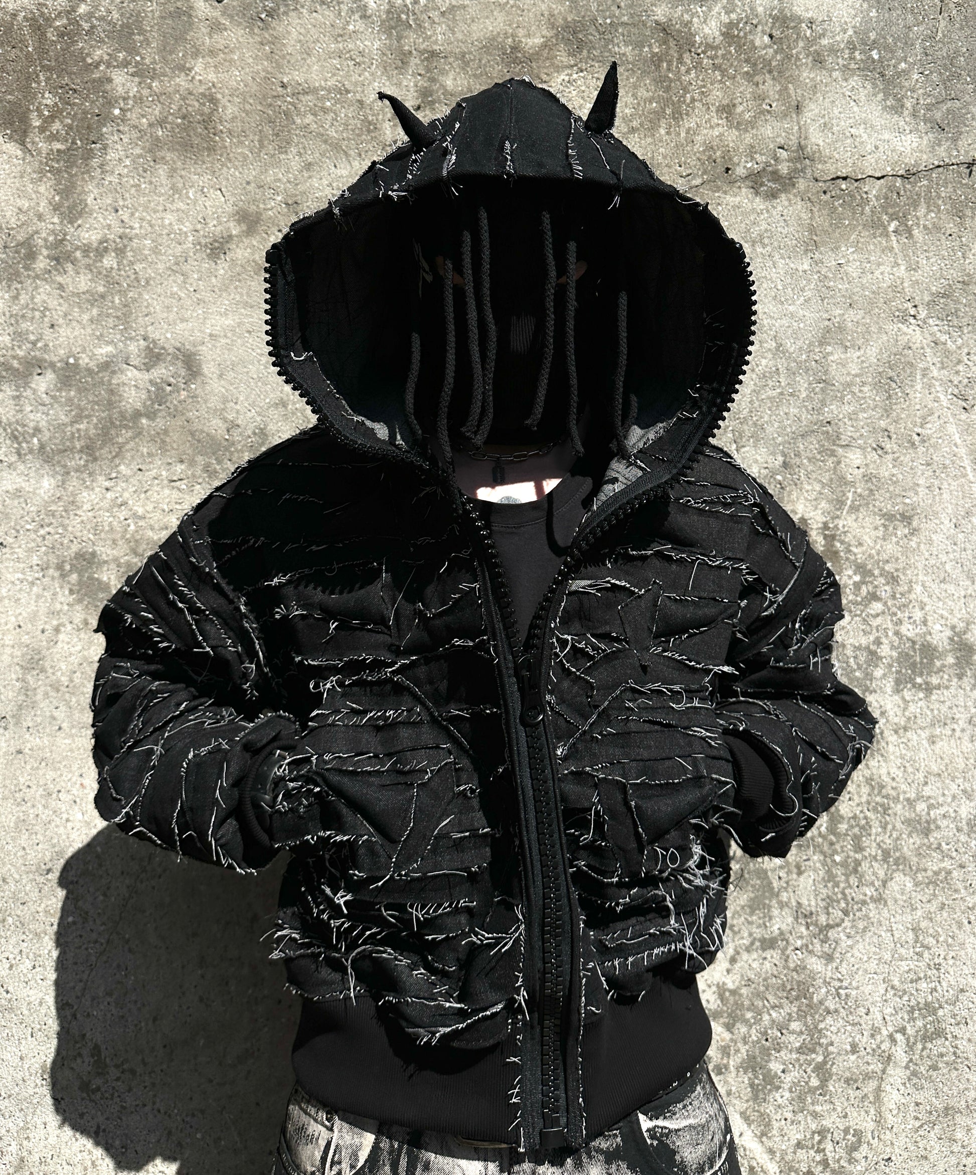 The cropped silhouette is balanced by volume through the sleeves and hood. Extended drawcords obscure the face, shifting focus from identity to form.
